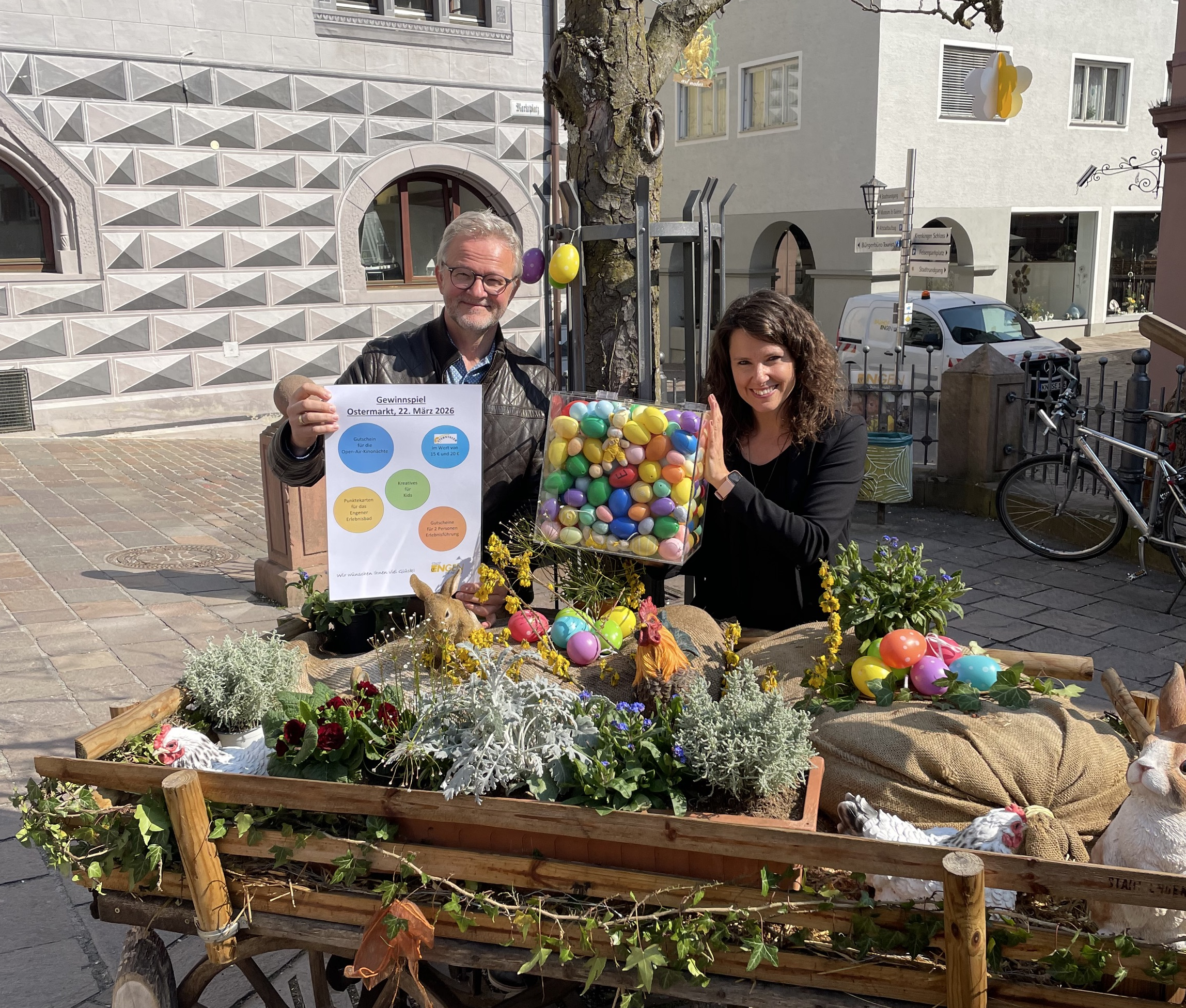 Am diesjährigen Ostermarkt wurde erneut das traditionelle Gewinnspiel im Rathaus durchgeführt. Daran haben sich 423 Personen beteiligt. Die Schätzfrage lautete: Wie viele Eier befinden sich in der Box? Die richtige Zahl lautet in diesem Jahr 301. Die Gewinner, die der richtigen Lösung am nächsten waren, können sich nun über tolle Gewinne freuen. Bei mehreren gleichen Lösungen hat das Los entschieden. Alle Gewinner wurden von der Stadtverwaltung schriftlich informiert und von der Jury (Peter Freisleben und Sabrina Küchler) zu ihrem Gewinn beglückwünscht.