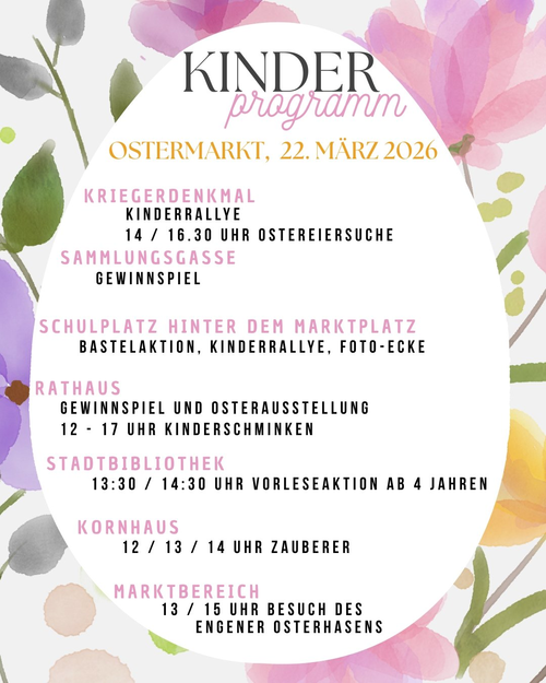 Auch für die kleinen Besucher ist ein vielfältiges Kinderprogramm geboten: Das Angebot reicht von einem Zauberer im historischen Kornhaus, Kinderschminken im Rathaus, einer Kinderrallye auf dem Schulplatz mit Bastelaktion bis hin zu vielen weiteren Aktionen an den Ständen. In der Stadtbibliothek gibt es um 13:30 Uhr und 14:30 Uhr eine Vorleseaktion für Kinder ab 4 Jahren. In diesem Jahr besucht die Kinder auch zum ersten Mal der Engener Osterhase um 13 Uhr und 15 Uhr. Auch in diesem Jahr bringt der Engener Osterhase seinen Osterhasenbriefkasten beim Bürgerbüro an und freut sich über gemalte und gebastelte Ostergrüße von kleinen und großen Kindern bis zum 30. März. Er schickt auch umgehend einen Antwortbrief zurück.