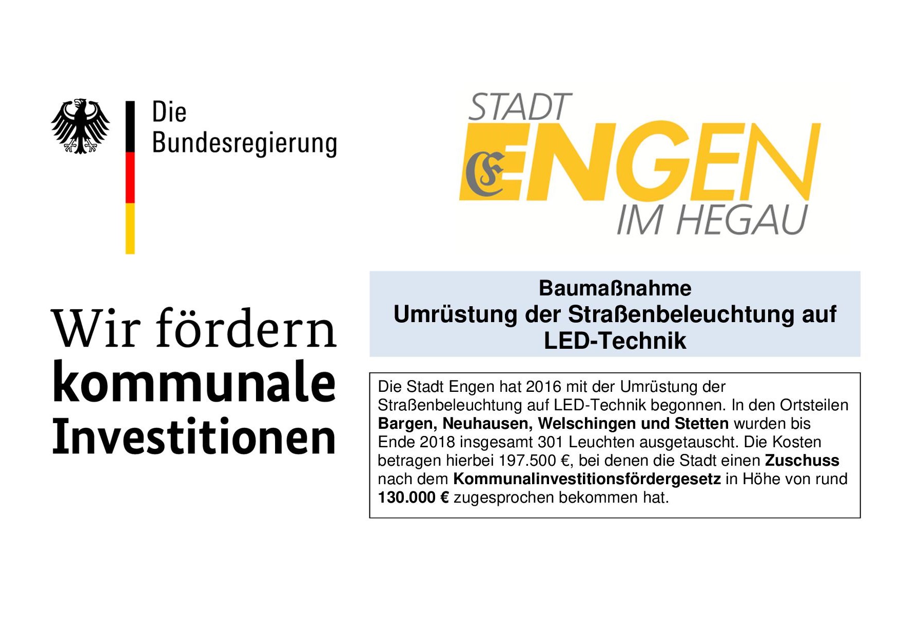 Die Stadt Engen hat seit 2016 bis Ende 2018 die Straßenbeleuchtung in den Ortsteilen auf LED-Technik umgerüstet. In den Ortsteilen Bargen, Neuhausen, Welschingen und Stetten wurden insgesamt 301 Leuchten ausgetauscht. Mit dieser Maßnahme kann ein wichtiger Beitrag zur Reduzierung der Treibhausgasemissionen geleistet werden.